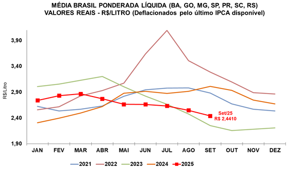 Gráfico 1. Série de preços médios recebidos pelo produtor (líquido), em valores reais (deflacionados pelo IPCA de setembro/2025)