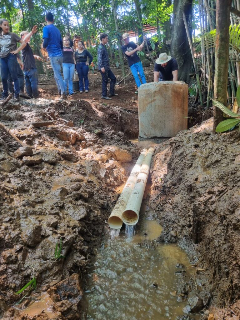 A programação contou com uma etapa teórica, abordando a importância da conscientização ambiental e das práticas de preservação das nascentes, seguida de atividades práticas em campo, nas quais os estudantes puderam acompanhar técnicas adotadas para proteger e recuperar fontes de água na propriedade.