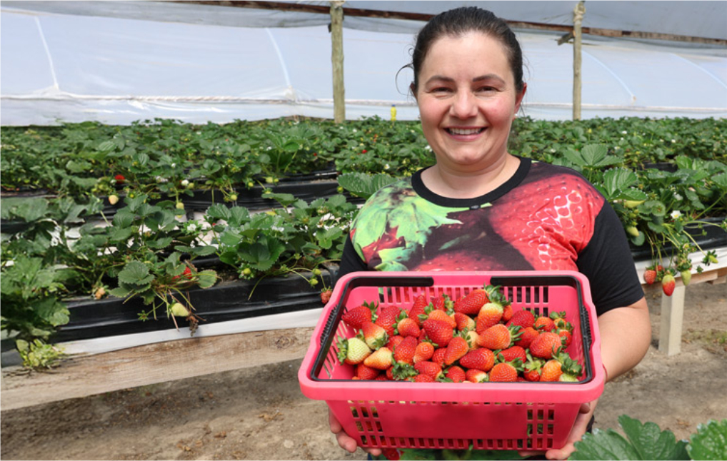 A produtora de morangos Maria Camila Calixto Fontes, proprietária da Chácara Nelson Pontes, em São José dos Pinhais, na Região Metropolitana de Curitiba (RMC), venceu o Prêmio ATeG 2025 na categoria Agricultura, promovido pelo Sistema CNA/Senar. A premiação reconhece os melhores resultados alcançados por produtores assistidos pelo Programa de Assistência Técnica e Gerencial (ATeG) em todo o país. A conquista também reconhece o trabalho da técnica de campo Eneida Maria Dolci, que acompanhou a produtora durante a ATeG do Sistema FAEP.