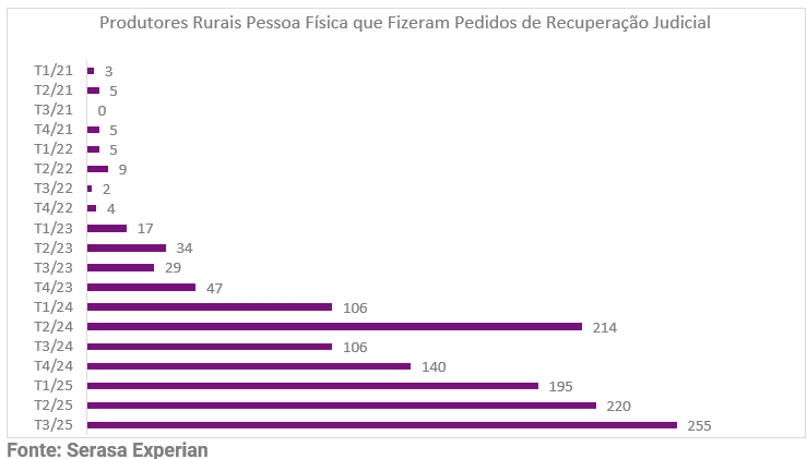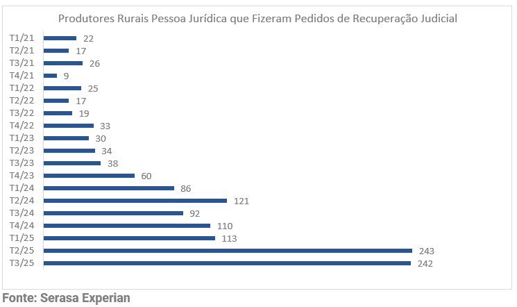 O índice mostra que os produtores rurais com perfil de Pessoa Jurídica acumularam 242 pedidos de recuperação judicial no terceiro trimestre de 2025. Em comparação ao mesmo período do ano anterior é possível identificar uma expansão. No gráfico a seguir os dados na íntegra: