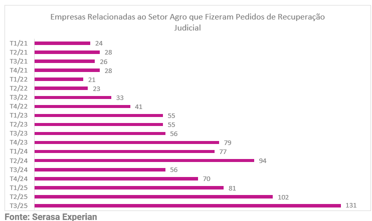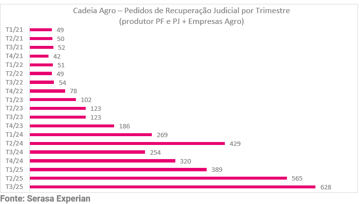 Novos dados da Serasa Experian, primeira e maior datatech do Brasil, revelam que o terceiro trimestre deste ano registrou a maior quantidade de pedidos de recuperação judicial desde 2021. Foram 628 requisições, frente às 254 registradas no mesmo período de 2024. Esse cenário reflete a piora no ambiente de crédito do setor – representando produtores rurais como pessoa física e jurídica, além de empresas relacionadas ao agronegócio. Confira no gráfico a seguir as informações de cada trimestre em toda a série histórica do índice: