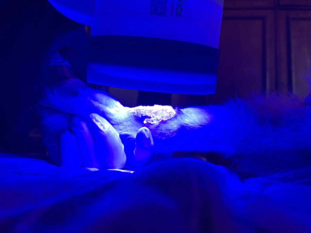 Diante da falta de resposta ao tratamento inicial, a dra. Daniela optou por uma abordagem diferente e inovadora: a fotobiomodulação. O protocolo era bem mais simples: incluía duas sessões consecutivas por semana, com intervalos de 7 dias, ao longo de cinco semanas. Totalmente indolor, cada sessão durou apenas dois minutos, tornando o processo rápido, tranquilo e confortável não apenas para Trufa, como também para seu tutor. Para conduzir o tratamento, a veterinária escolheu o sistema Phovia®, da Vetoquinol Saúde Animal, uma tecnologia de luz fluorescente que estimula a regeneração natural da pele e acelera a cicatrização.
