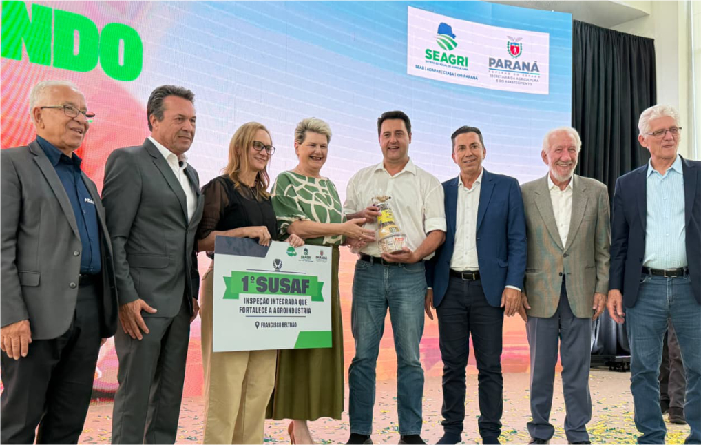 Francisco Beltrão foi homenageado pelo Governo do Paraná durante solenidade realizada no Palácio Iguaçu, em Curitiba, em reconhecimento ao pioneirismo do município na adesão ao Sistema Unificado Estadual de Sanidade Agroindustrial Familiar do Paraná (SUSAF-PR). O momento marcou a entrega da certificação de número 200 do programa no Estado.