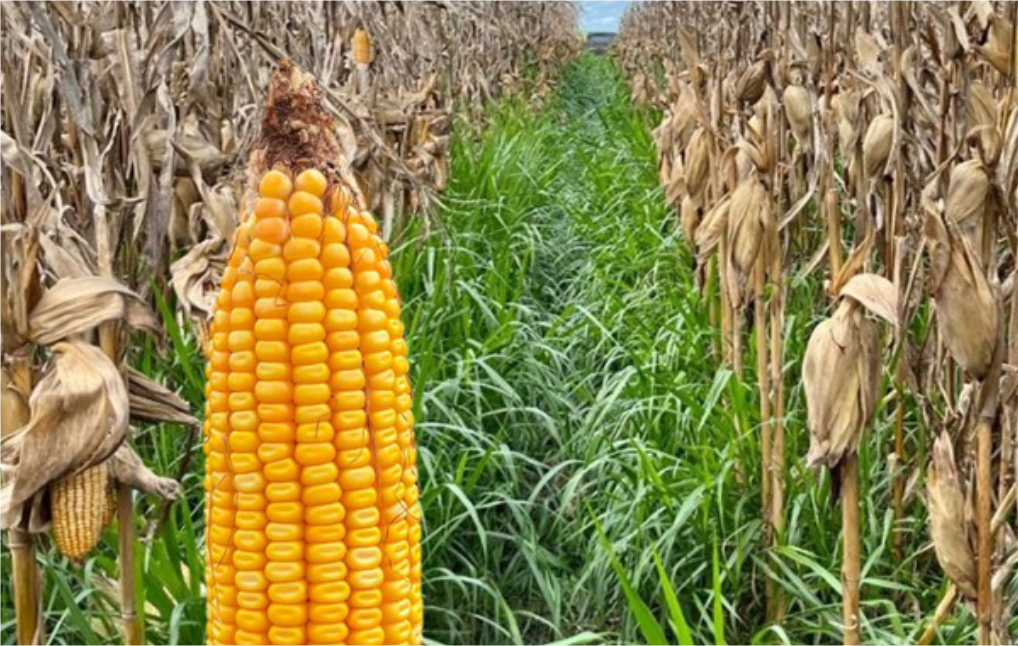 Outra estratégia é a semeadura do capim em linha, nas entrelinhas do milho, quando o cereal estiver entre os estádios V3 e V5. Nesse caso, a competição é naturalmente menor e não há necessidade de realizar o travamento do capim com herbicidas.